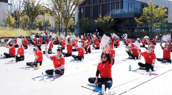 10月2日上午8点,100多位伽人齐聚南京汤山温泉康养小镇广场,用健身瑜伽马拉松挑战赛的方式,庆祝新中国成立75周年!初秋的南京略有些寒意,却无法阻挡伽人们的热情。随着清晨的第一缕阳光洒满小镇,一张张瑜伽垫铺开在广场中央,如同在祖国的广袤大地上展开一幅绚丽画卷,而她们早已做好准备迎接108遍的健身瑜伽马拉松挑战了!