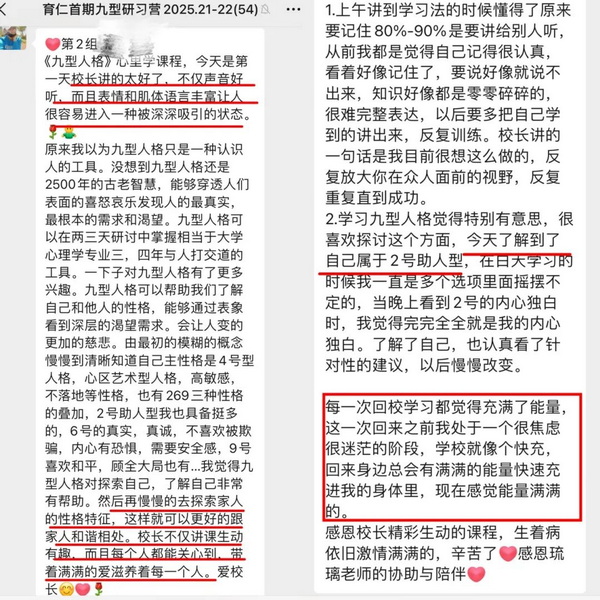 “自觉的履行尘世间赋予你的一切角色并勇于承担就是成功”为了更好探索九型人格,助力学员们精准定位自我性格,课程环节安排了极具针对性的个人案例剖析,她们惊叹于自我认知的盲区被瞬间照亮,欣喜于人际交往的难题找到了破解之钥,纷纷表示:这场研习之旅,实在是受益匪浅!